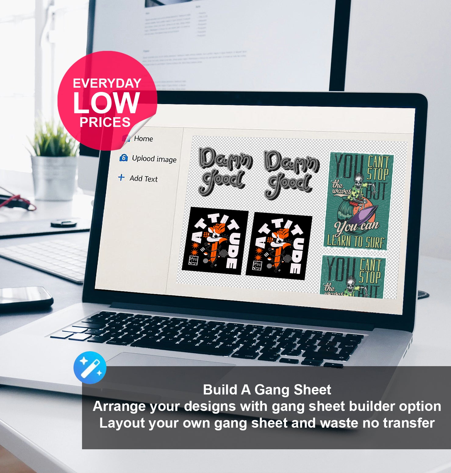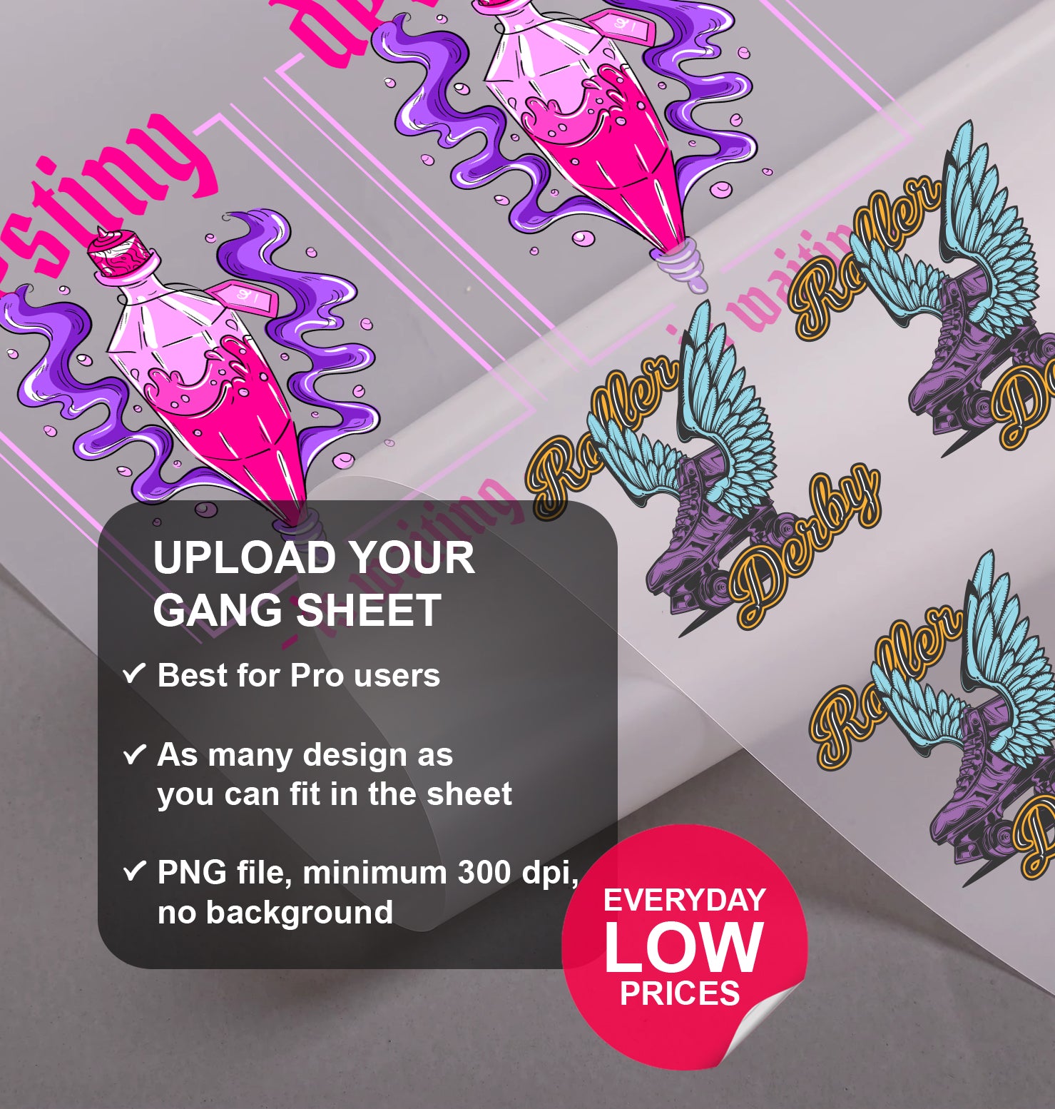 Our DTF Gang Sheet Builder makes custom printing simple, flexible, and cost-effective. Instead of placing multiple separate orders, you can combine all your designs onto a single sheet — perfect for logos, graphics, and artwork of any kind.
