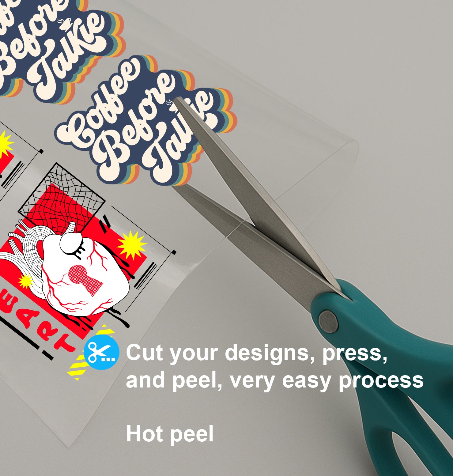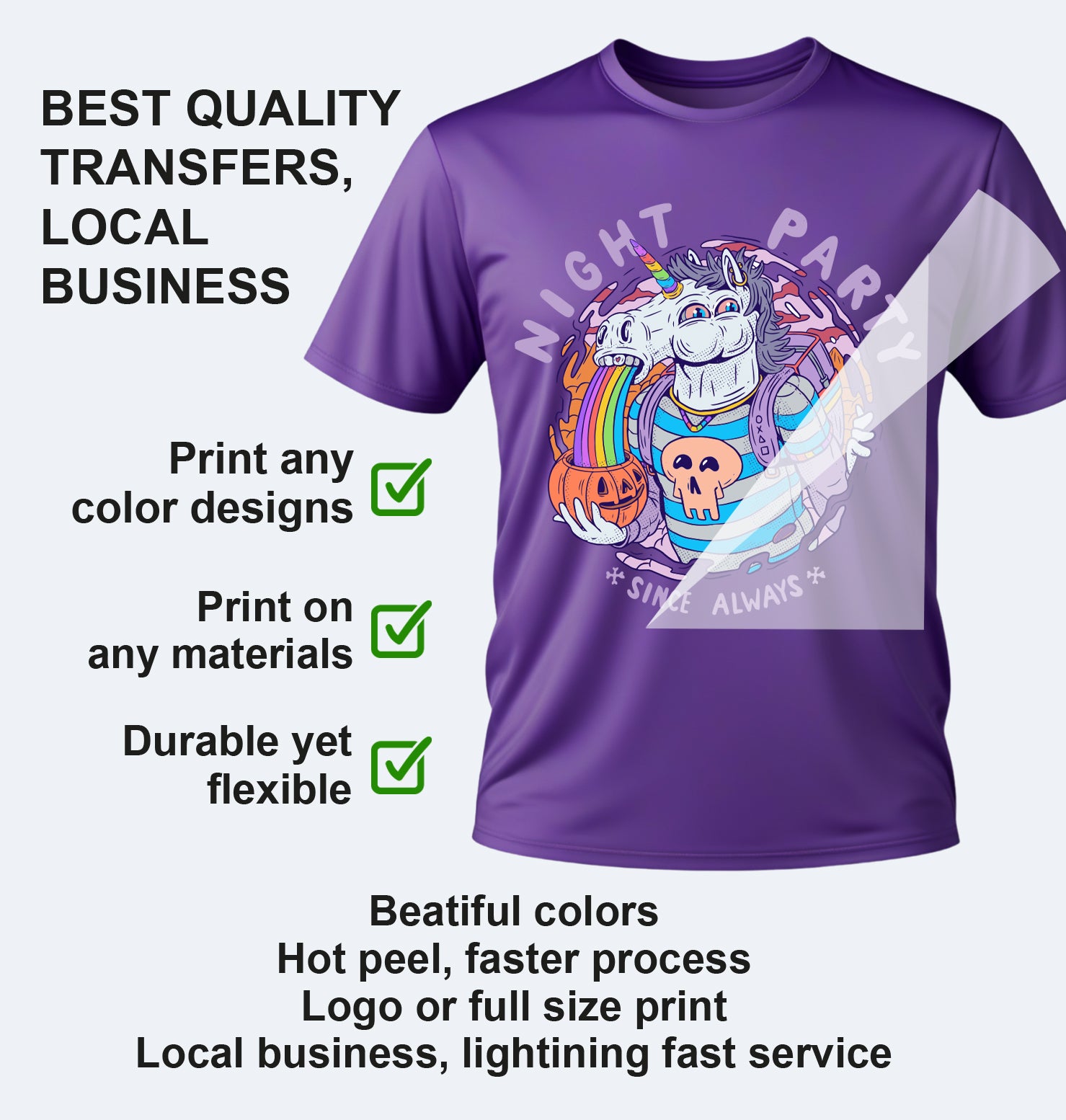 Each transfer is printed with premium inks and high-quality film, producing vivid colors, fine detail, and long-lasting durability. Whether you’re creating custom shirts, hoodies, hats, or promotional items, this option ensures you get exactly the transfer size you need — with no waste and no hassle.